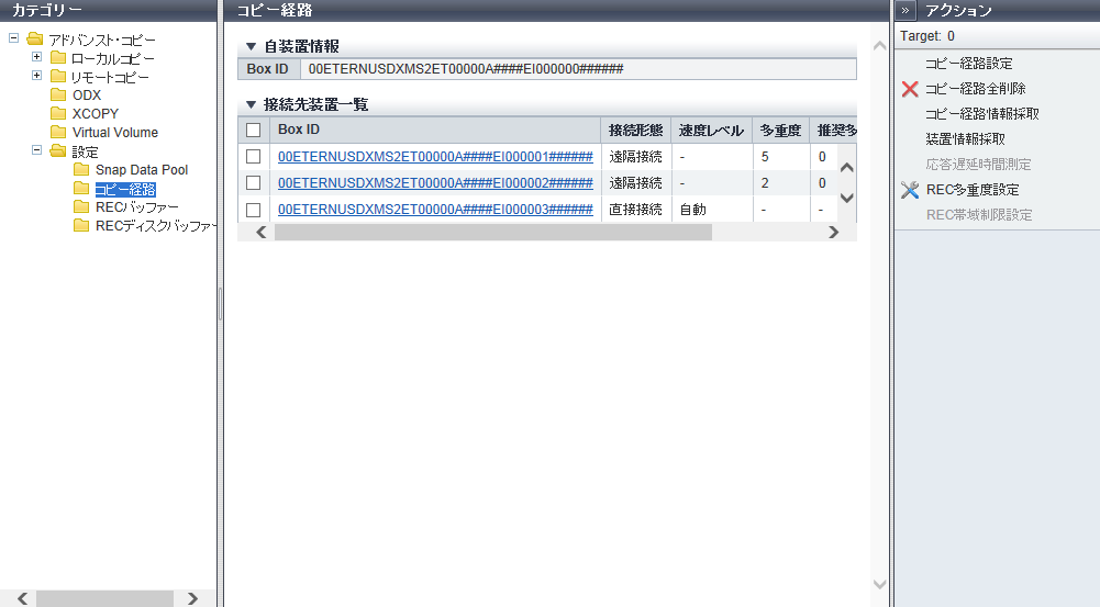 自装置と経路が設定されている接続先装置のBox IDが表示されます。 クリックすると[ コピー経路詳細 ] 画面が表示されます。 |