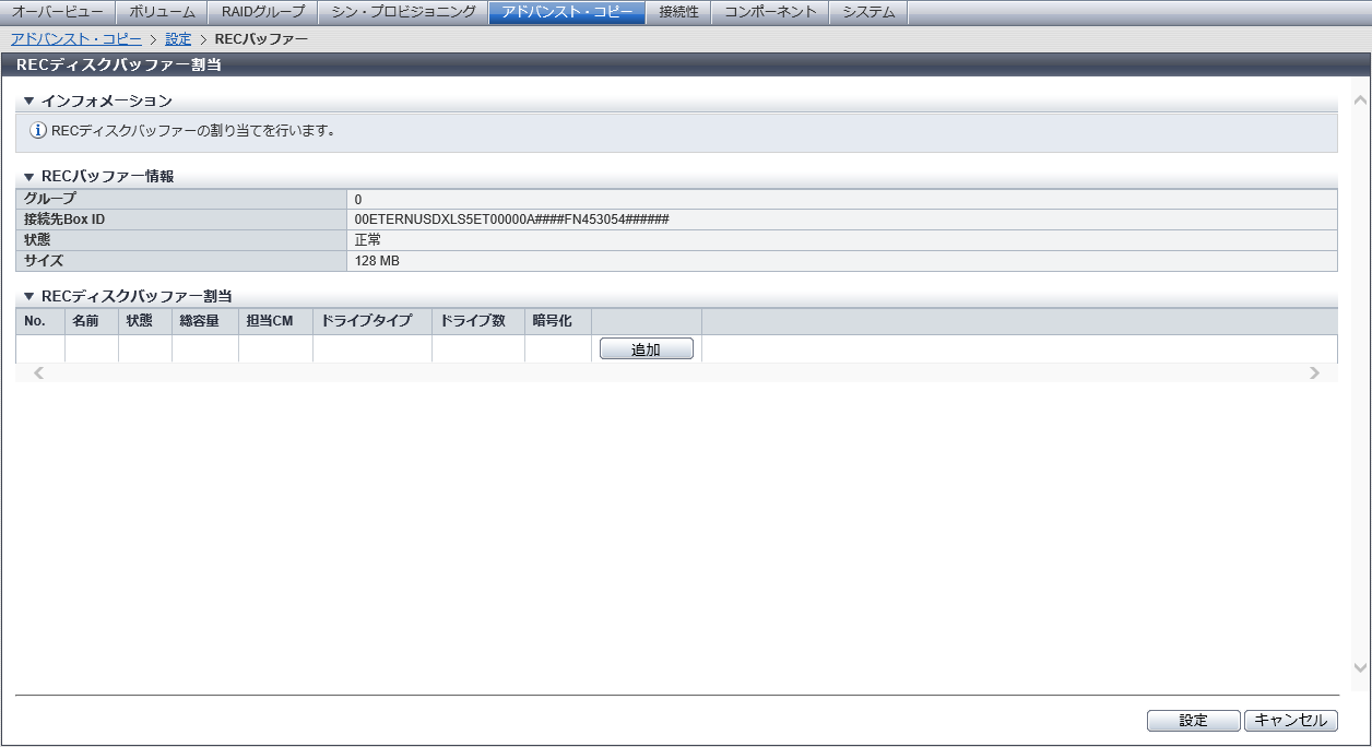 備考RECディスクバッファーの割り当てを削除する場合は、該当RECディスクバッファー(RAIDグループ)の [ 削除 ] ボタンをクリックします。