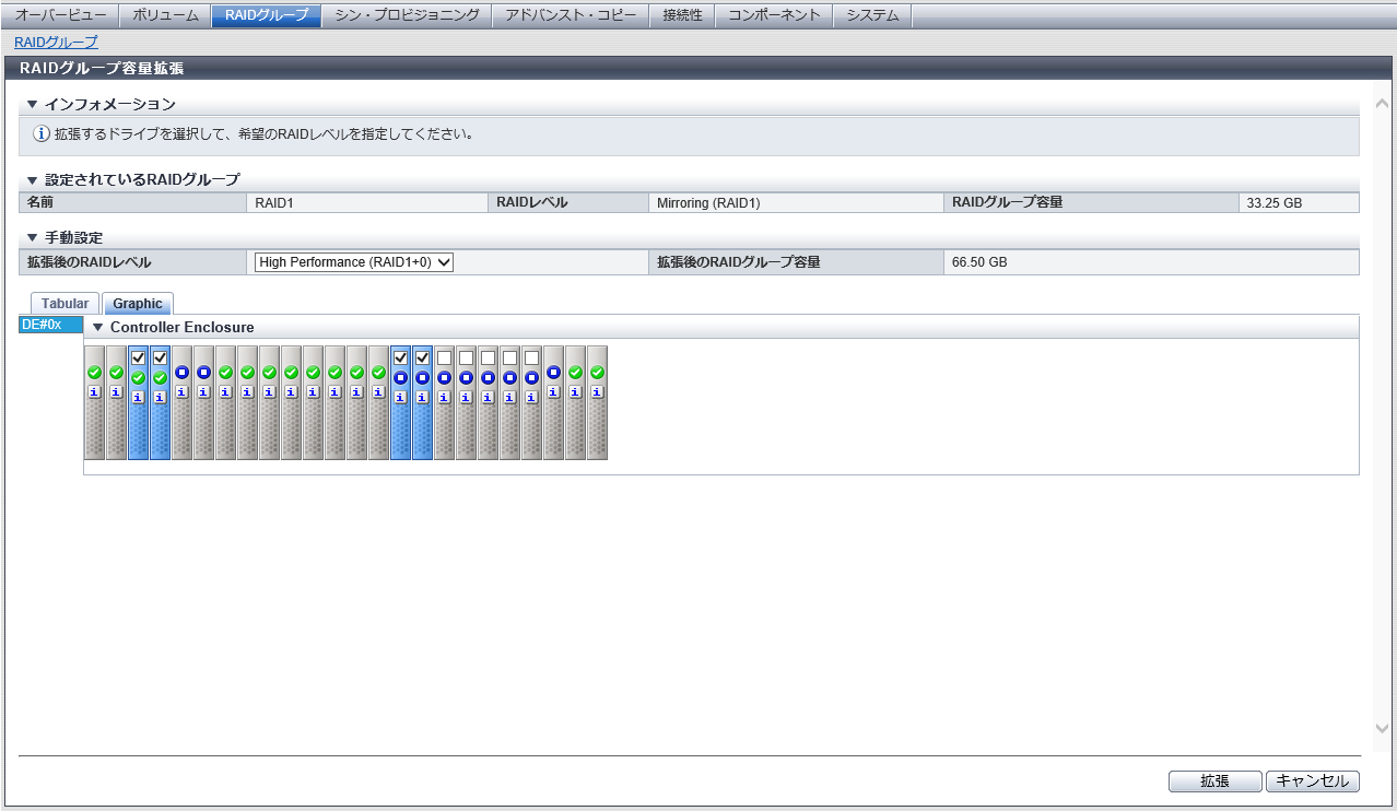 2. 拡張後のRAIDレベル、および使用するドライブを選択し、[ 拡張 ] ボタンをクリックします。