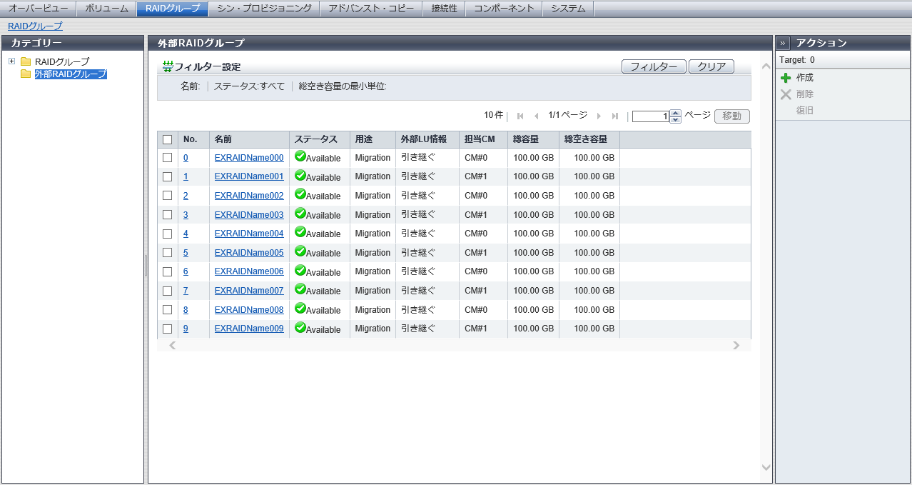 事前に、外部RAIDグループの作成が必要です。詳細は、「外部RAIDグループ作成」を参照してください。
