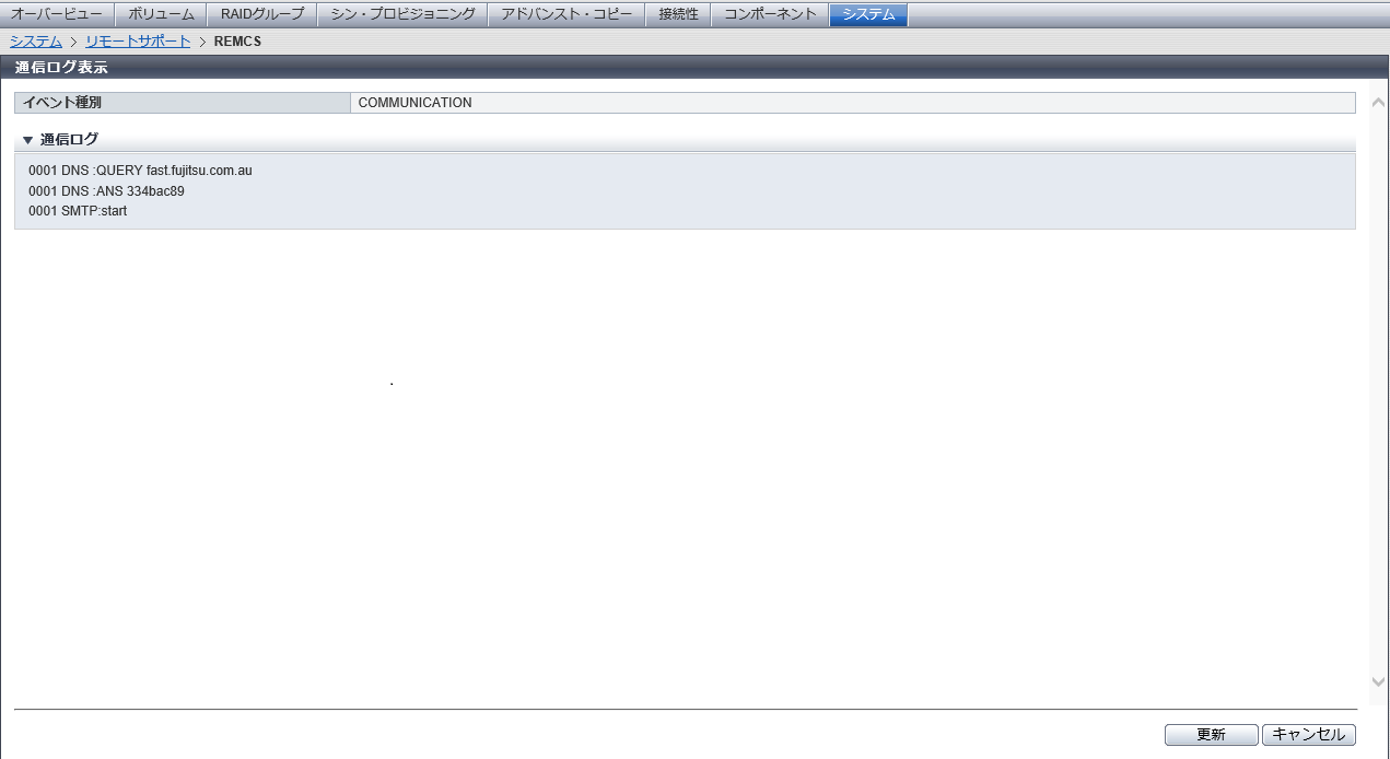 リモートサポート (REMCS) 機能動作時の通信ログが表示されます。イベント種別と通信ログを確認します。