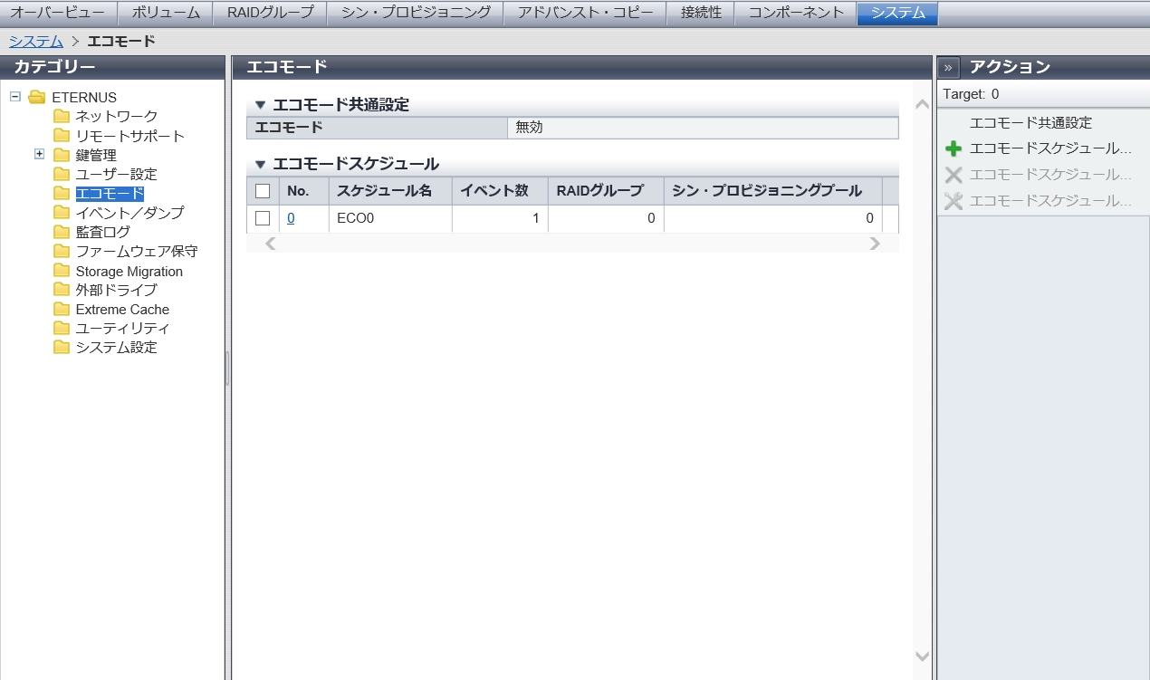エコモードスケジュール名が表示されます。 ストレージ基盤ソフトウェアがエコモード制御中の場合、「External」が表示されます。 |
