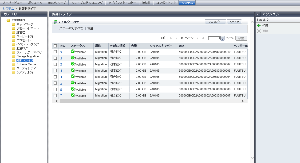 外部ドライブが「外部LU情報」を引き継いでいるかどうかが表示されます。 「外部LU情報」を引き継いでいる場合、「引き継ぐ」が表示されます。 「外部LU情報」を引き継いでいない場合、「-」(ハイフン)が表示されます。 |