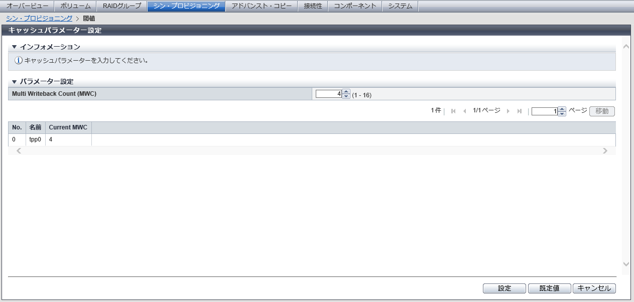 備考[ 設定 ] ボタンをクリックする前に、[ 既定値 ] ボタンをクリックすると、キャッシュパラメーターを初期値に戻せます。