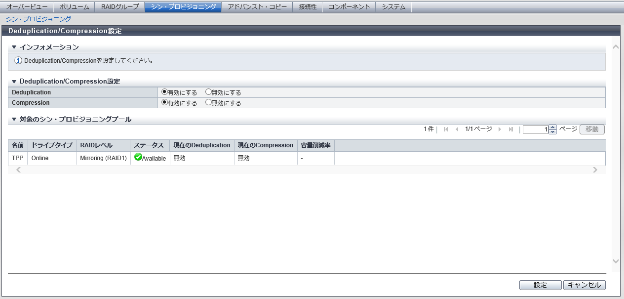 「Deduplication」および「Compression」の有効/無効を選択し、[ 設定 ] ボタンをクリックします。