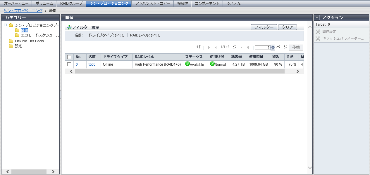 シン・プロビジョニング機能の有効/無効を確認する場合は、「設定(シン・プロビジョニング)」を参照してください。
