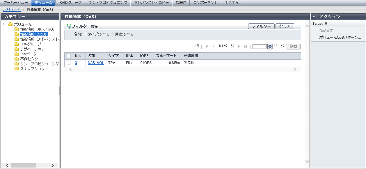 QoS動作モードの有効/無効に関係なく、ボリュームQoSの性能情報が表示されます。QoS動作モードが無効の場合、帯域制限はすべて初期値(「無制限」)で表示されます。