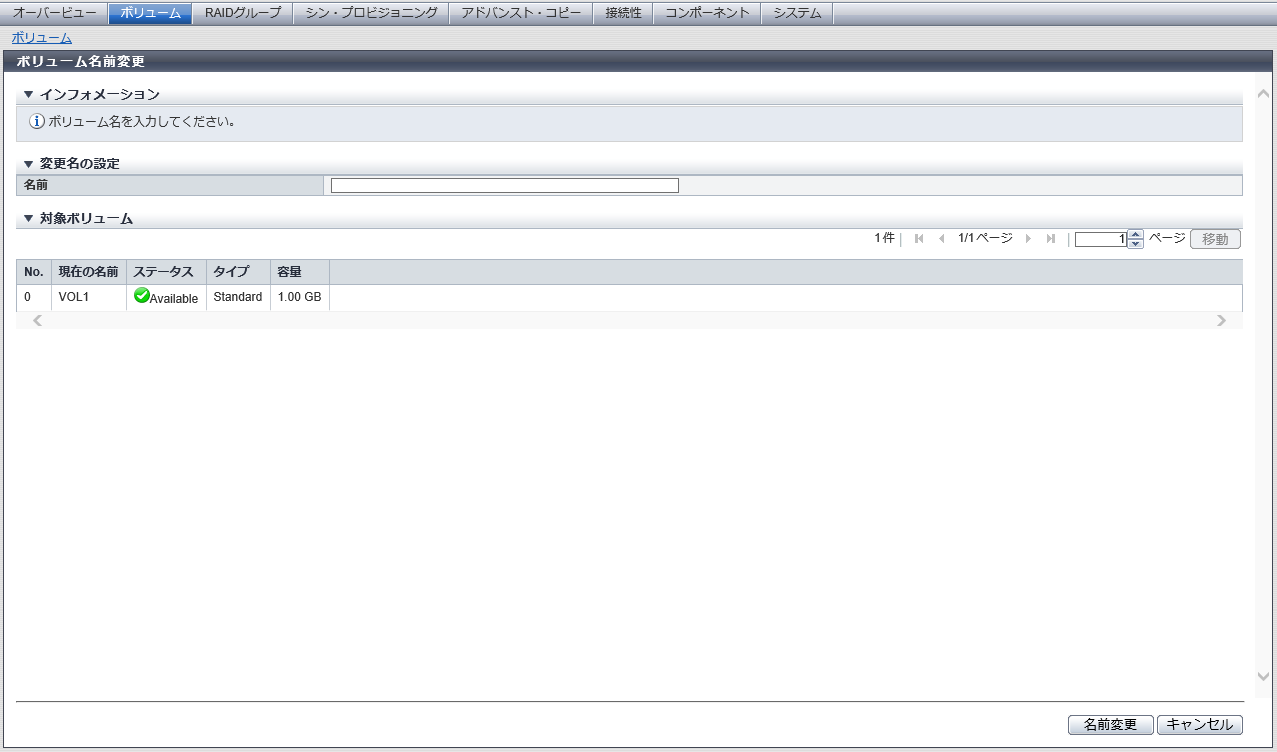 新しいボリューム名を入力します。 1ボリューム選択時、すでに存在するボリューム名は付けられません。 「$SYSVOL」、「$VVOL_META」、または「$DATA_CNTNR」で始まるボリューム名は付けられません。 |