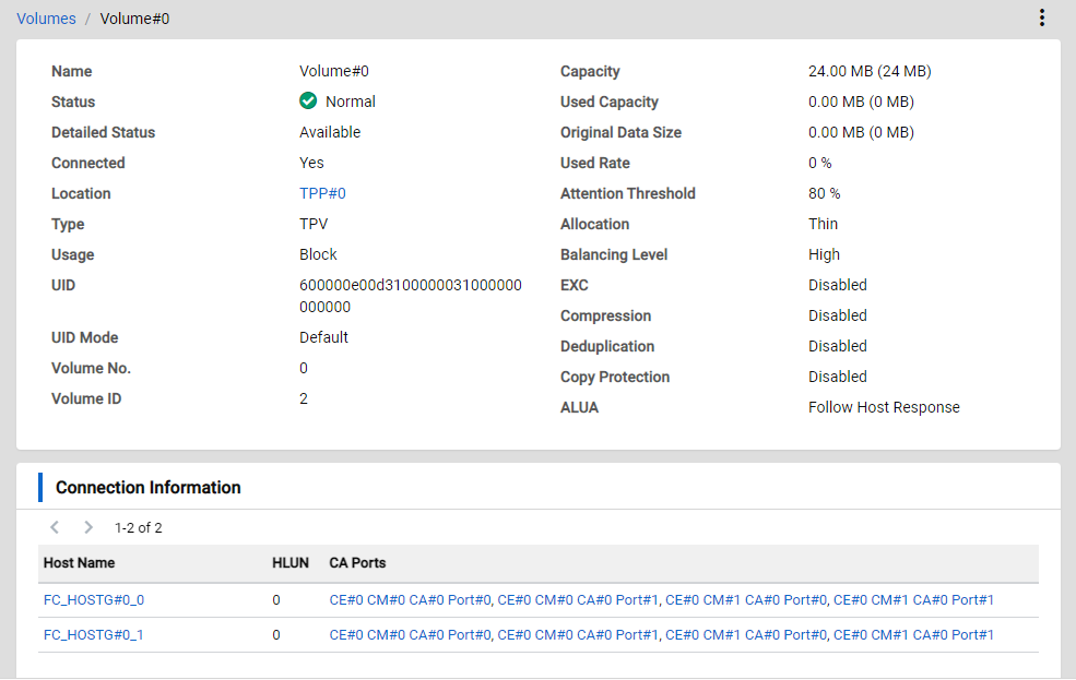 The name of the CA port that can be used to reference the corresponding volume from the host is displayed. Click a CA port name to display its Detail View. |