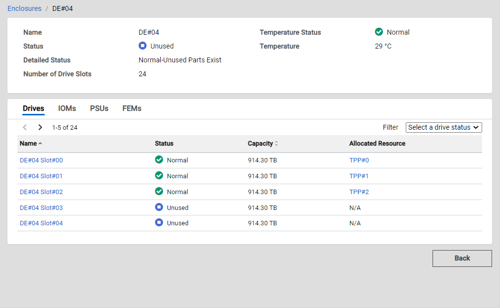 The detailed enclosure status is displayed.