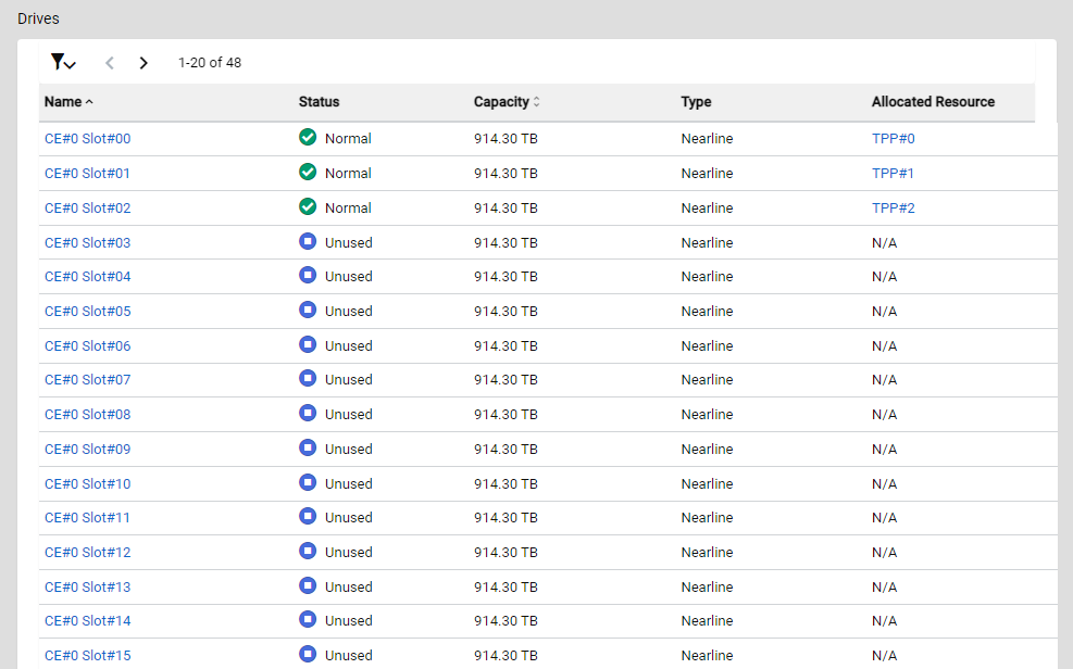 The name of the Thin Provisioning Pool, Flexible Tier Pool, or RAID group that is configured by the drive is displayed. For Dedicated Hot Spares, the RAID group name where the Dedicated Hot Spare is registered is displayed. For Thin Provisioning Pools, click a pool name to display its Detail View. Information