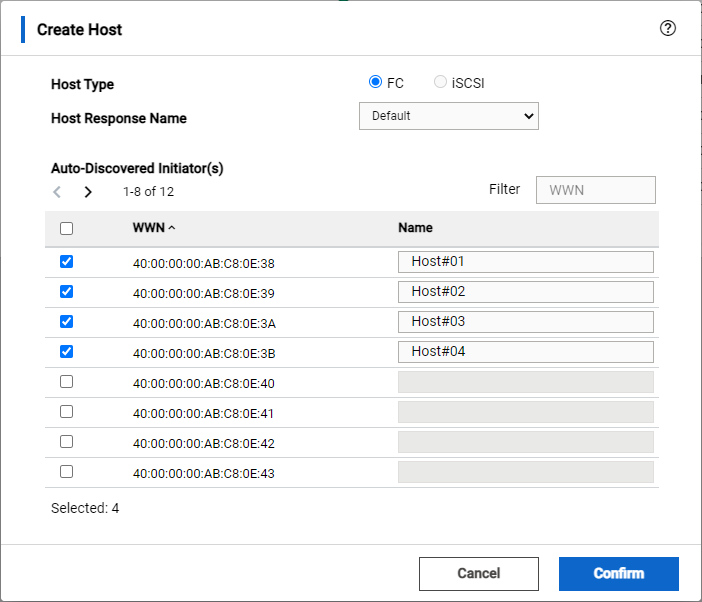 A dialog for entering the required information to perform actions. For example, enter information such as the host name to create a host. Click the [Confirm] button to display the Summary Dialog.
