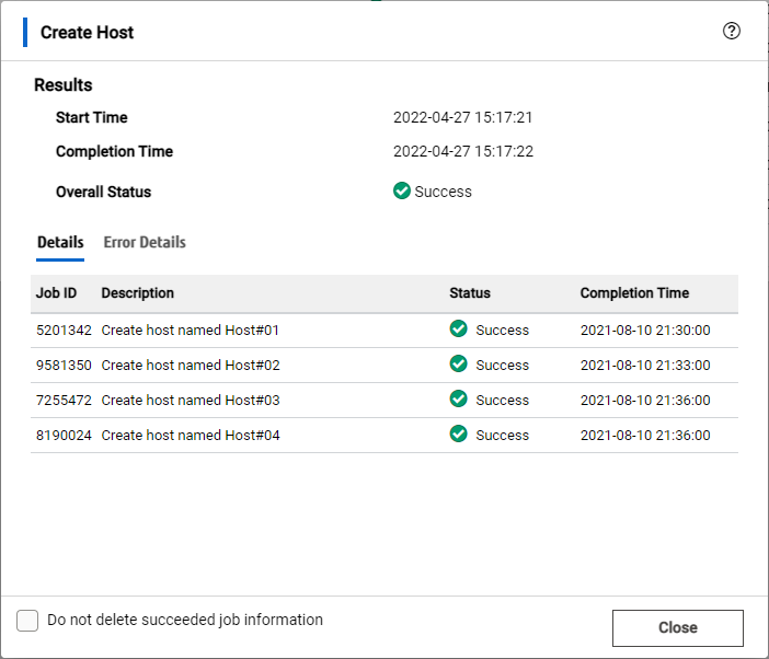 Actionの進捗状況を確認するDialogです。Easy Administration Viewでの装置の構成変更を伴う操作は、「Job」という単位で管理されます。Result Dialogでは、作成されたJobの進捗状況や実行結果が表示されます。Result Dialogを閉じてもJobはバックグラウンドで実行され続けます(Result Dialogを閉じたあとにJobの実行結果を確認したい場合は、Global MenuからJob List Viewを表示してください。)