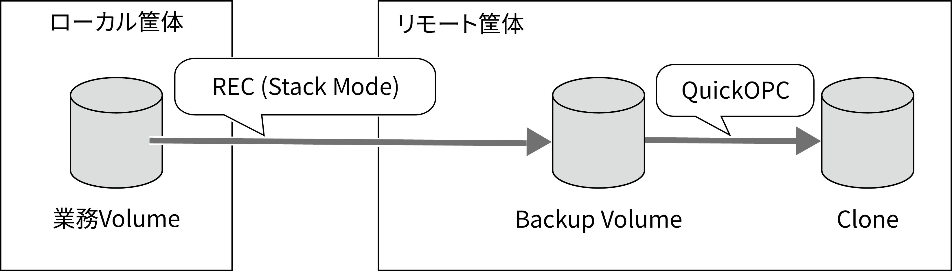 非同期StackモードのRECとQuickOPCを使用して、リモート筐体に業務Volumeのバックアップを定期的に作成する運用を記載します。業務Volumeがある筐体が被災した場合でも、バックアップを作成した時点でのデータを保証できます。ミラーVolumeをリモート筐体に作成する場合に比べて、コピー経路の回線帯域が小さいときでも、業務Volumeのレスポンス性能劣化を最小限にしつつ、リモート筐体にバックアップを作成できます。