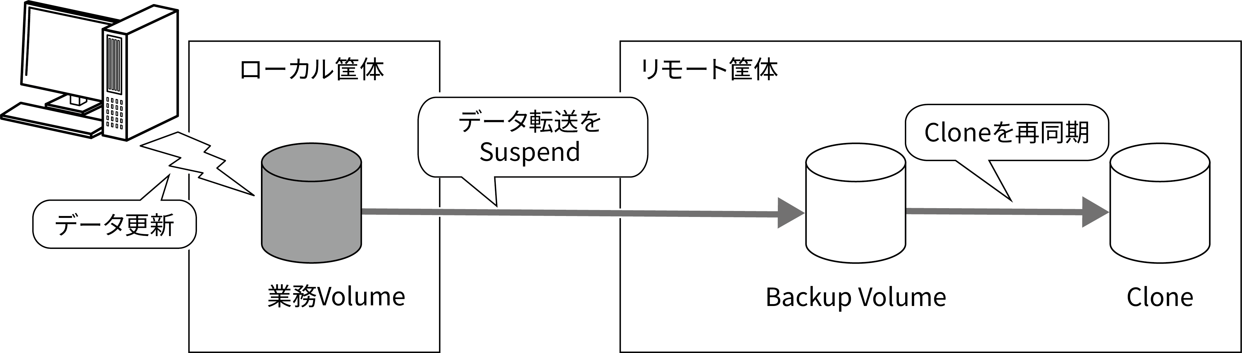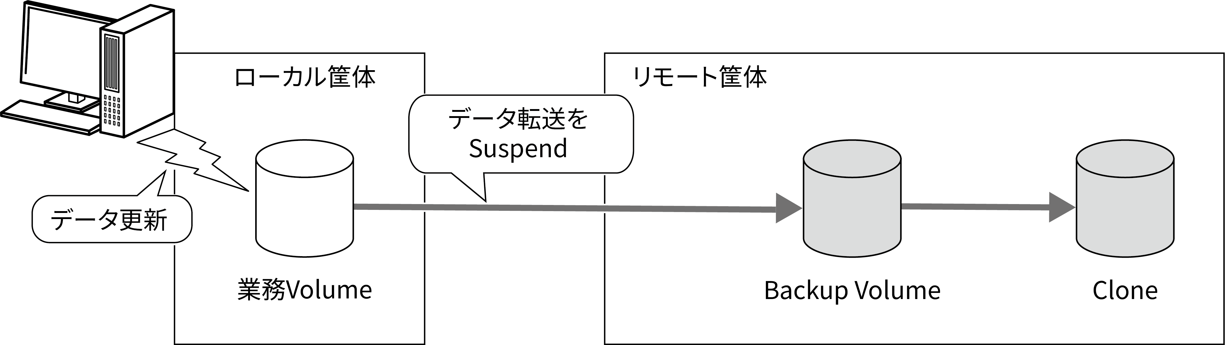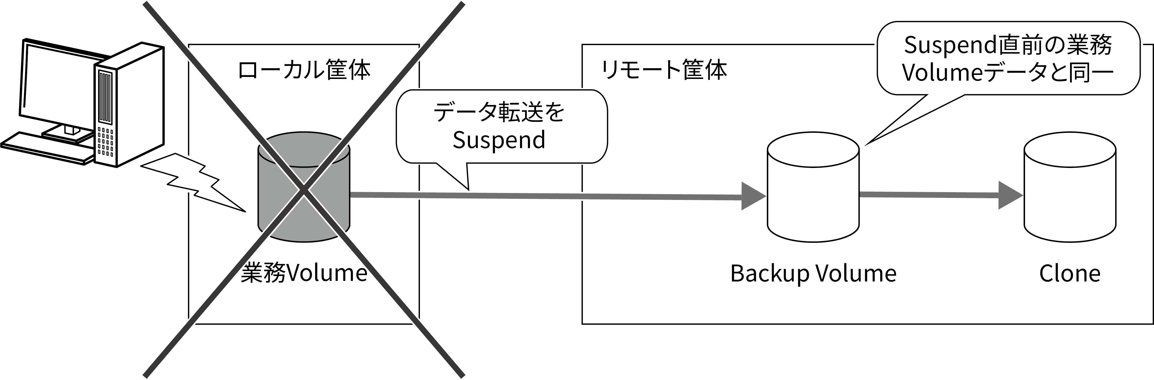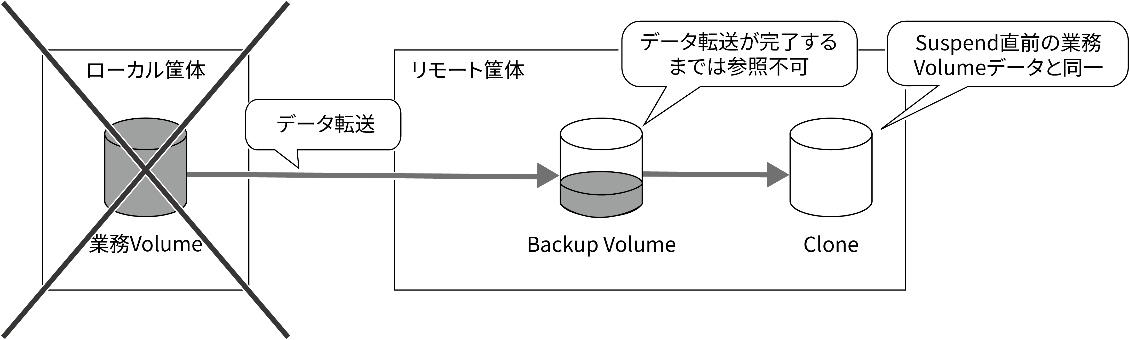 データ転送の際、順序性は保証されていないため、データ転送中はリモート筐体のバックアップVolumeのデータを参照できません。そのため、Suspend中に再同期しておいたリモート筐体のバックアップVolumeのCloneからデータを復旧する必要があります。