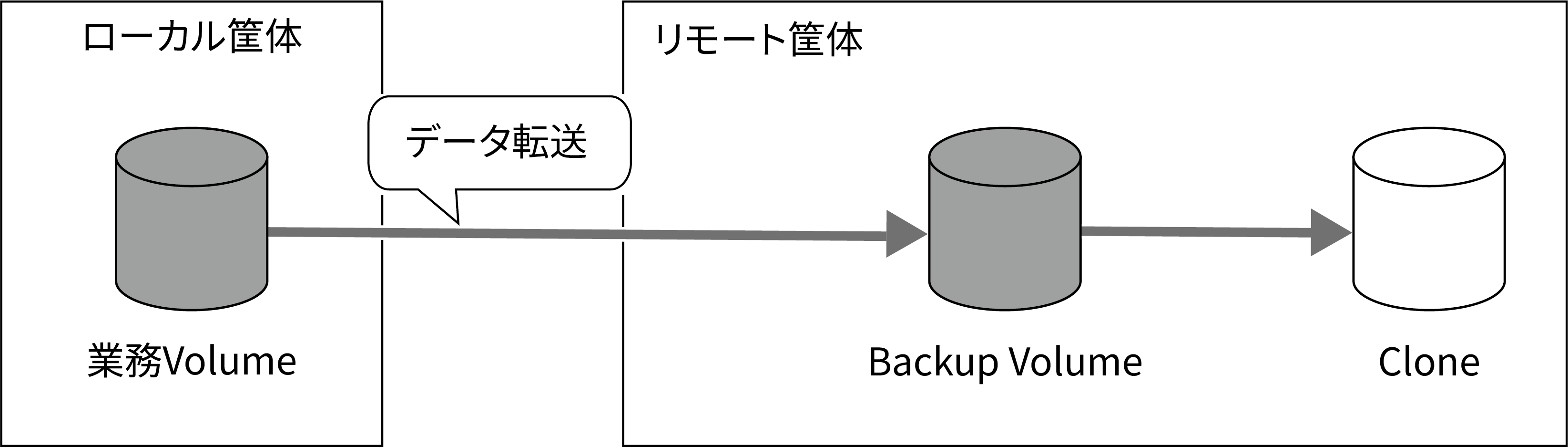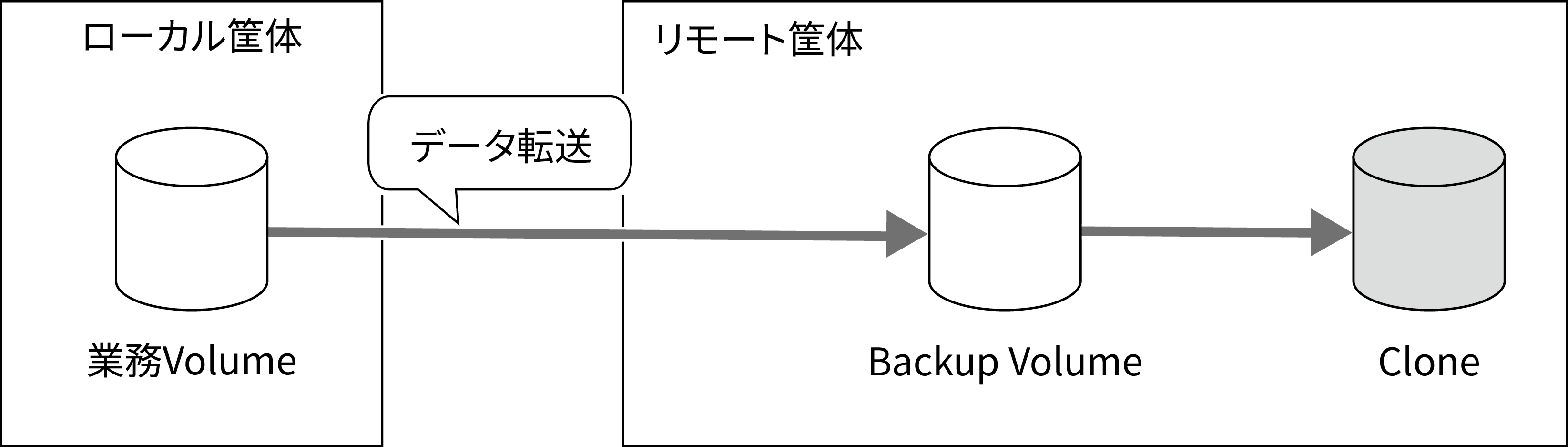 非同期Stackモードでの運用の場合、データの転送時に業務Volumeに書き込まれたデータの順序保証を行わないため、データ転送中はリモート筐体のバックアップVolumeのデータを参照できない状態になります。そのため、データ転送中にローカル筐体が被災した場合であっても、リモート筐体のCloneからデータを復旧できるように、データ転送開始前にバックアップVolumeのCloneをリモート筐体に作成する必要があります。