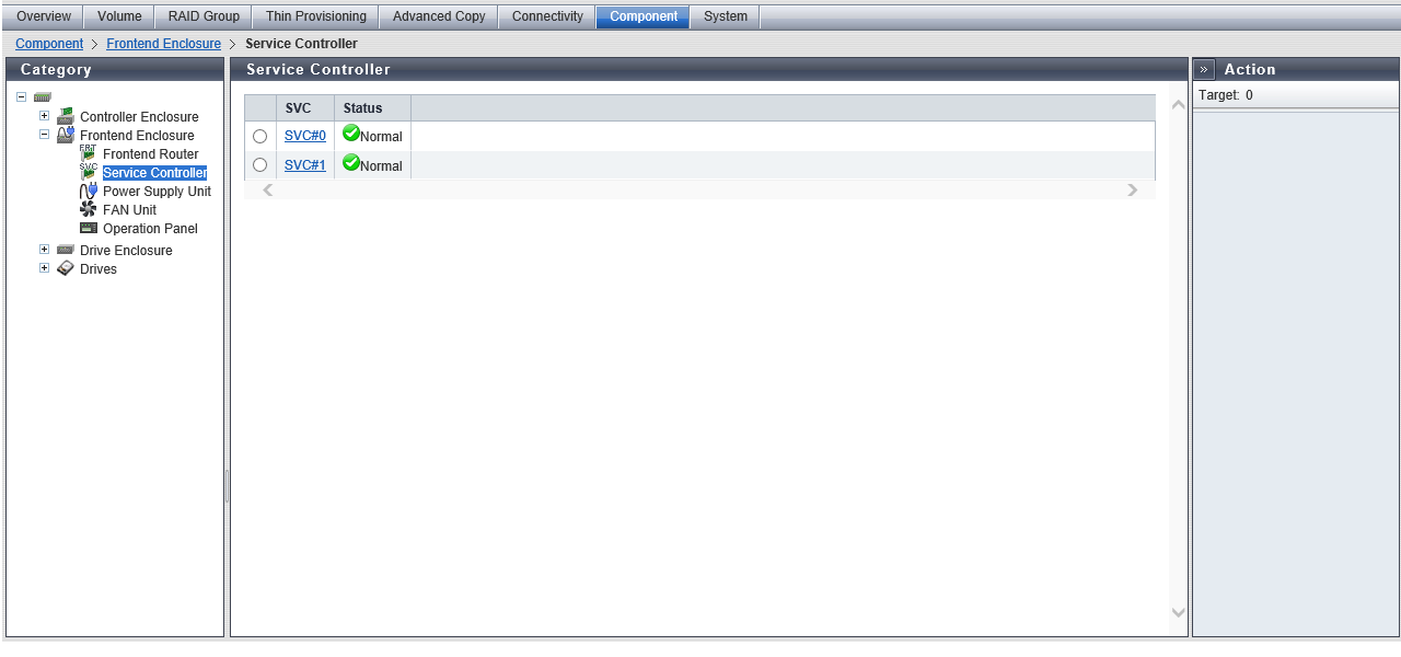 The front view of the FE that is installed in the storage system is displayed. Components that are not the target SVC are grayed out. The SVC status is displayed with an icon. Refer to Component Status for details. |