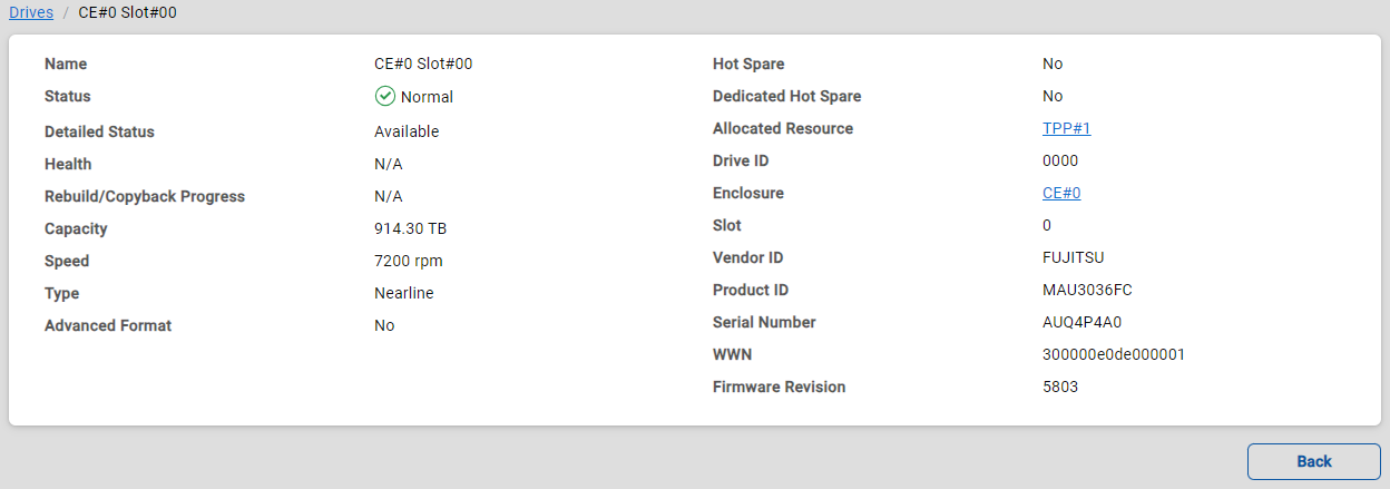 The name of the Thin Provisioning Pool, Flexible Tier Pool, or RAID group that is configured by the drive is displayed. For Dedicated Hot Spares, the RAID group name where the Dedicated Hot Spare is registered is displayed. For Thin Provisioning Pools, click a pool name to display its Detail View. Information