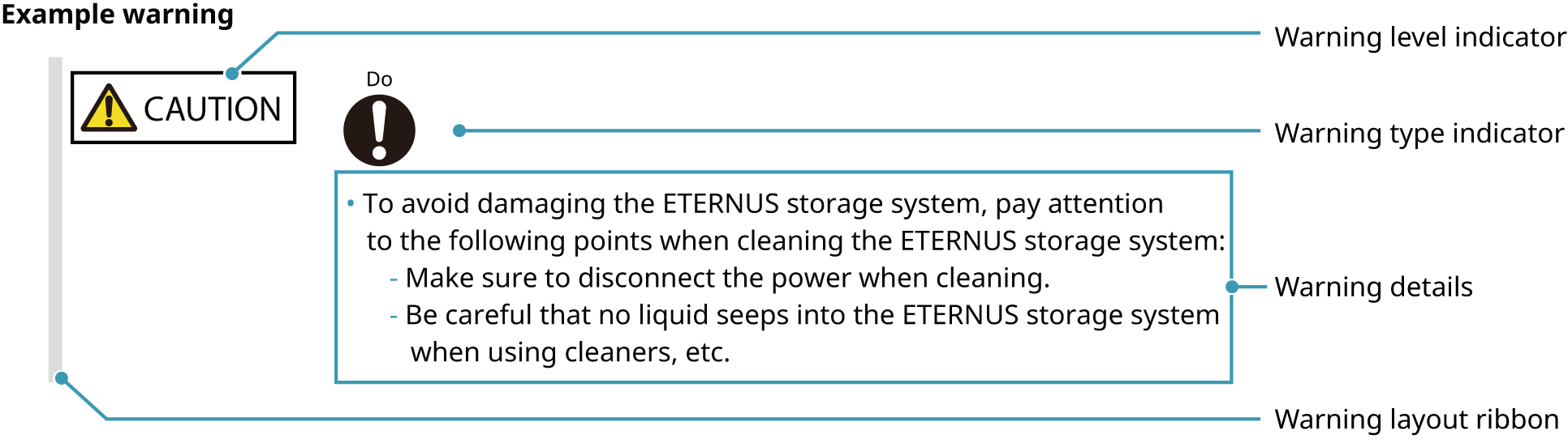 A message is written beside the symbol indicating the caution level. This message is marked with a vertical ribbon in the left margin, to distinguish this warning from ordinary descriptions.