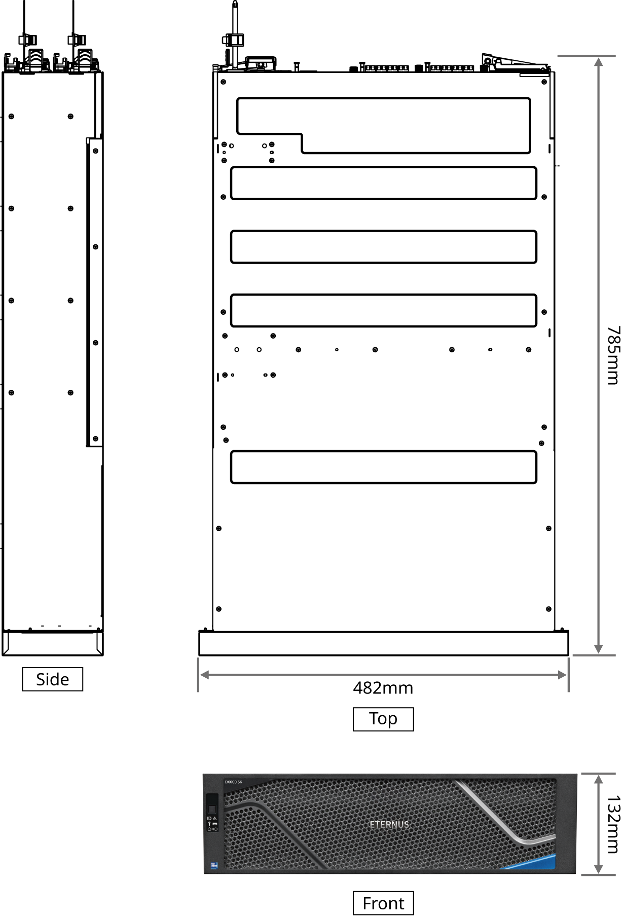 < PREVNEXT > Controller Enclosure Dimensions The following diagrams show the dimensions of a controller enclosure. The dimensions are approximations and do not include protruding parts. Figure: Controller Enclosure Dimensions < PREVNEXT >