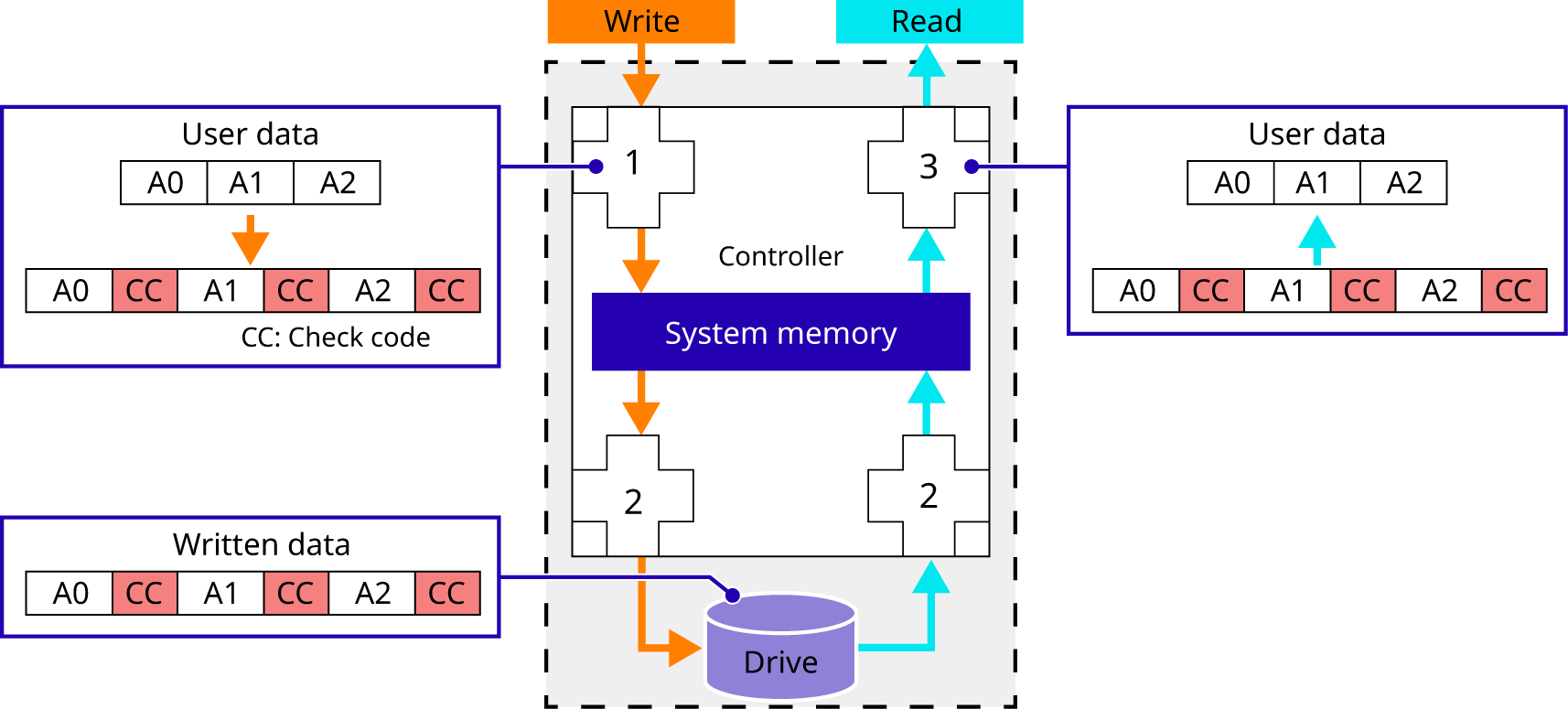 If an error is detected while data is being written to a drive, the data is read again from the data that is duplicated in the system memory. This data is checked for consistency and then written.