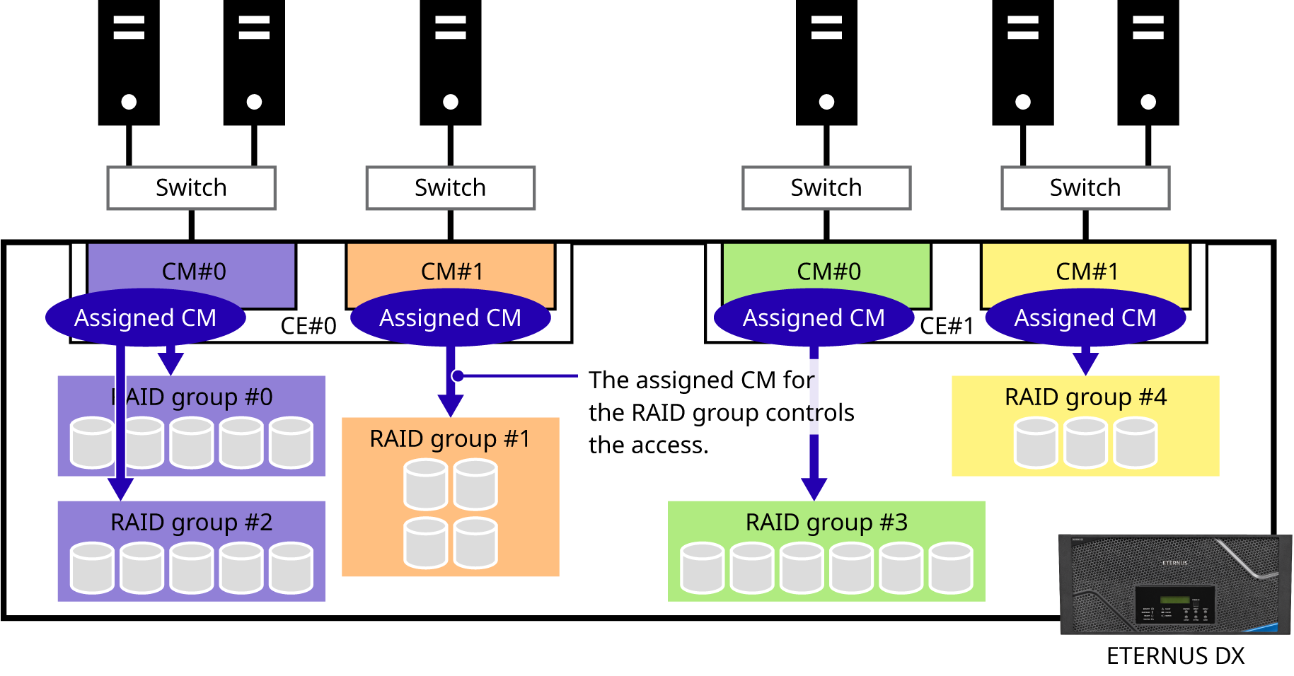 A controller that controls access is assigned to each RAID group and manages the load balance in the ETERNUS DX. The controller that controls a RAID group is called an assigned CM.
