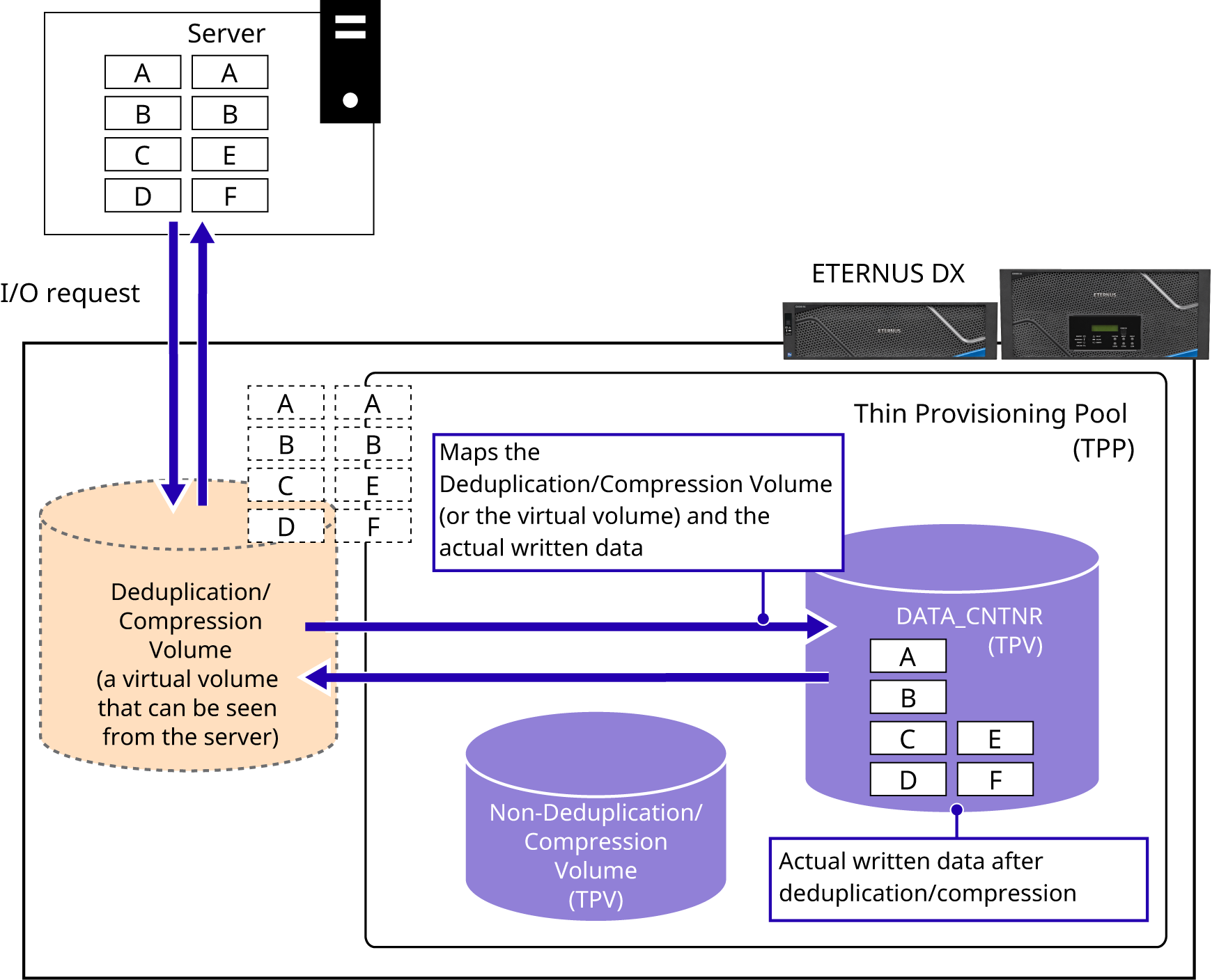 The ETERNUS DX performs data deduplication/compression in synchronization with the I/O from the server.