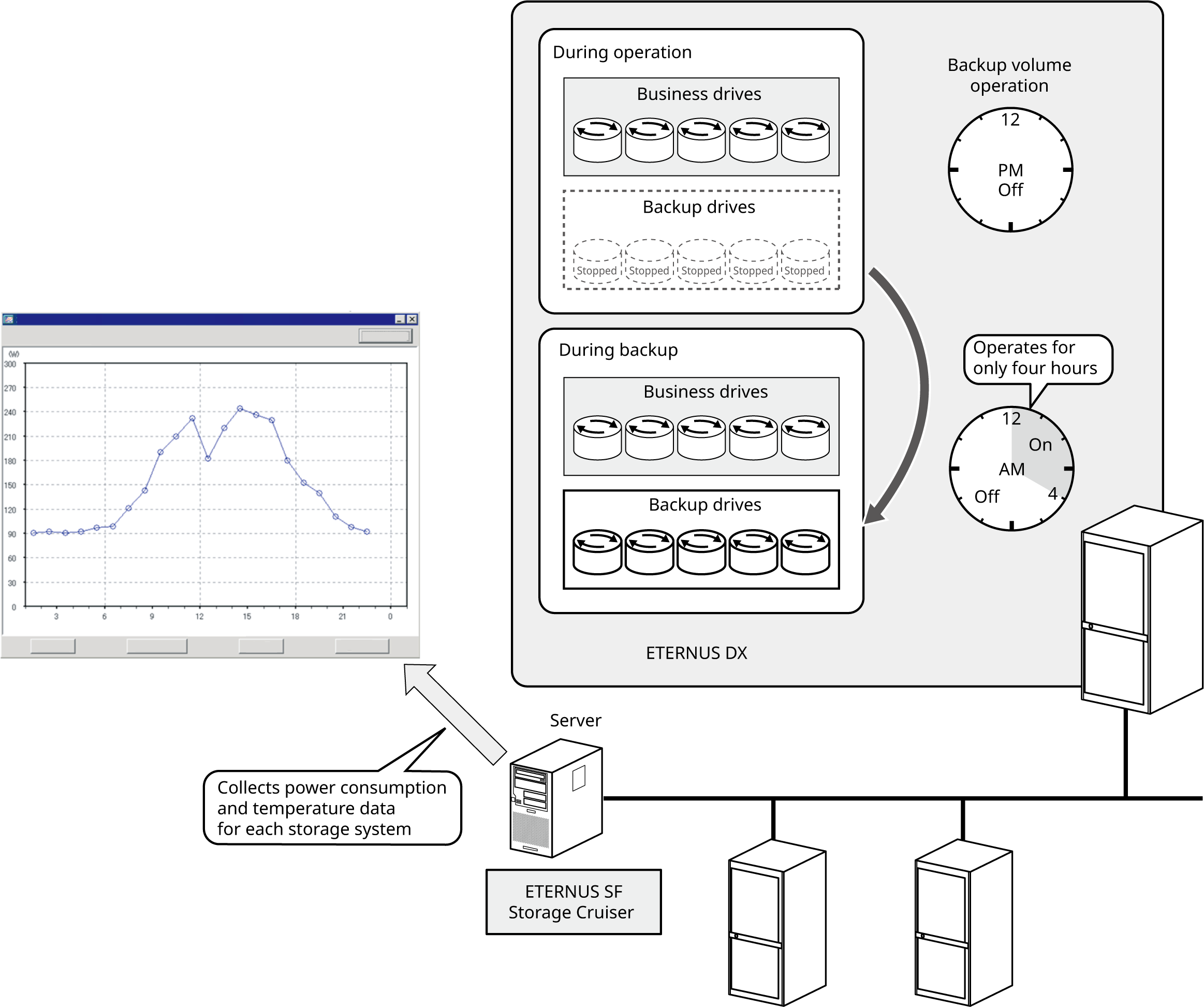 If the backup time period is predetermined, power saving operations can be implemented effectively by setting the Eco-mode schedule for backing up disk drives to only activate the disks when required. The disks motor or the disks power can be turned on and off according to the backup operation state using ETERNUS SF AdvancedCopy Manager.