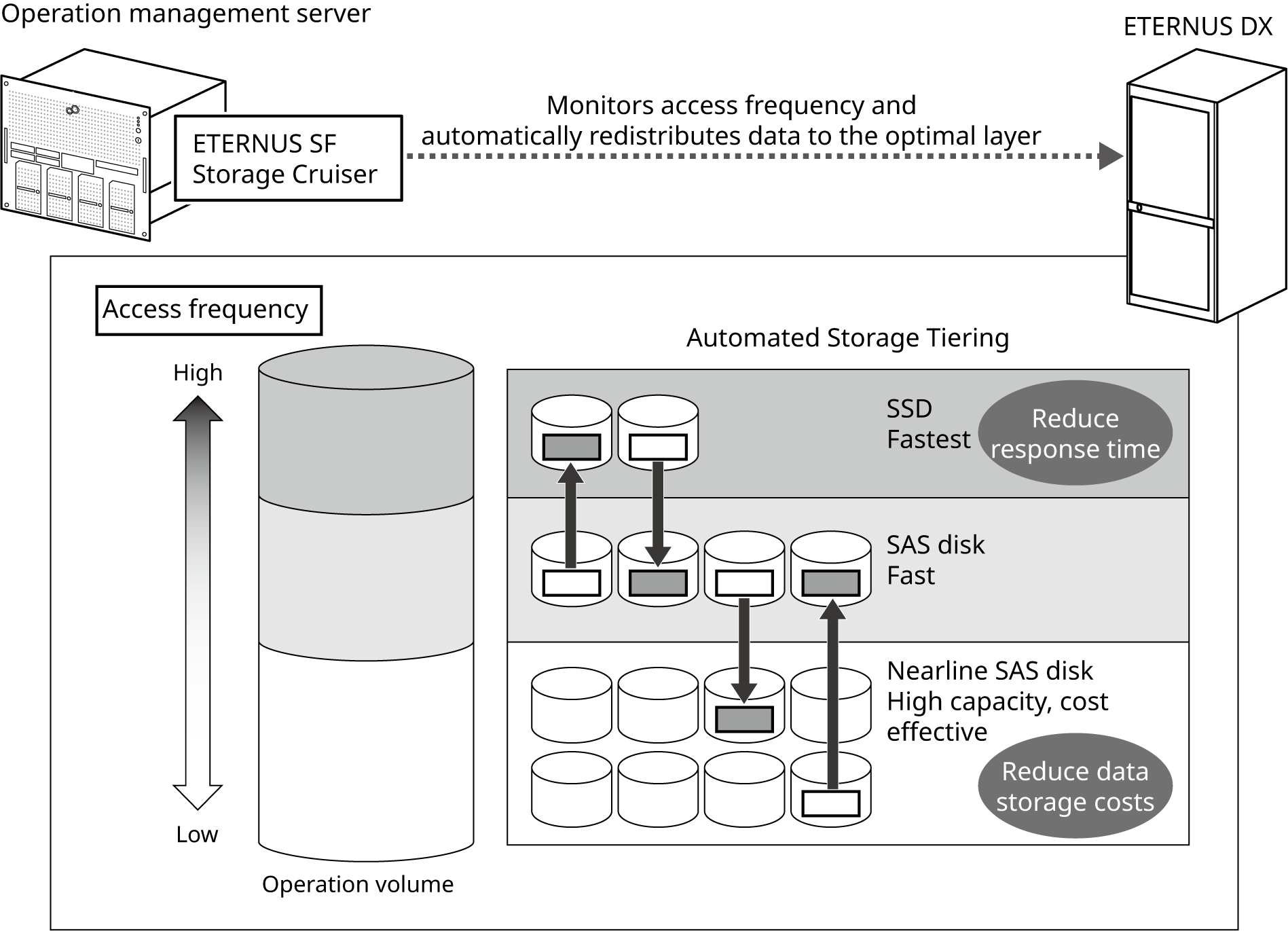 By storing the less frequently accessed data to cost effective Nearline SAS disks with a large capacity, storage cost can be reduced. By storing the frequently accessed data to high performance SSDs, response time are reduced and performance is improved.