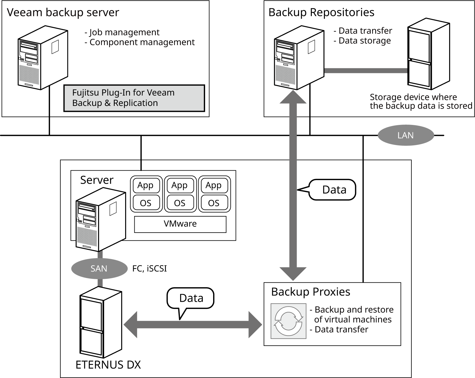 The ETERNUS DX improves the operability and efficiency of the backups in virtual environments (VMware) using Veeam Storage Integration to link with Veeam Backup & Replication provided by Veeam Software.