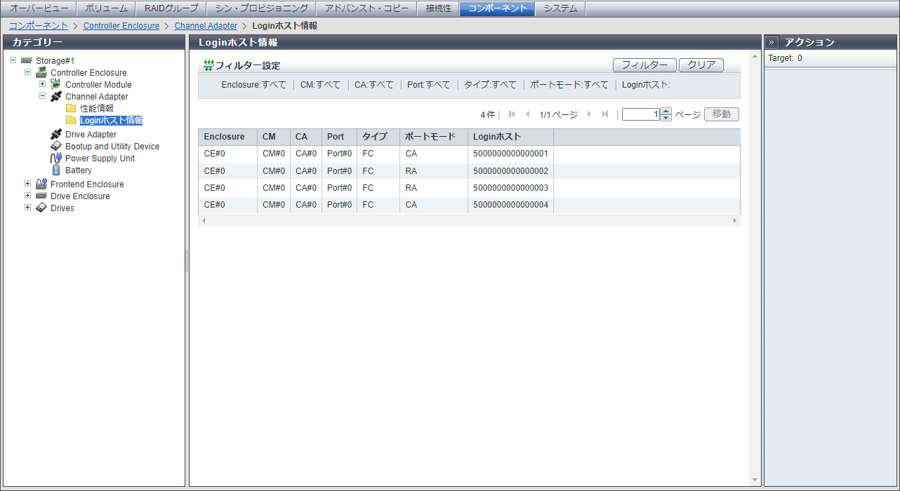 ポートにログインしているホスト情報が表示されます。 1ポートに複数のホストがログインしている場合、以下のようにホストごとに表示されます。