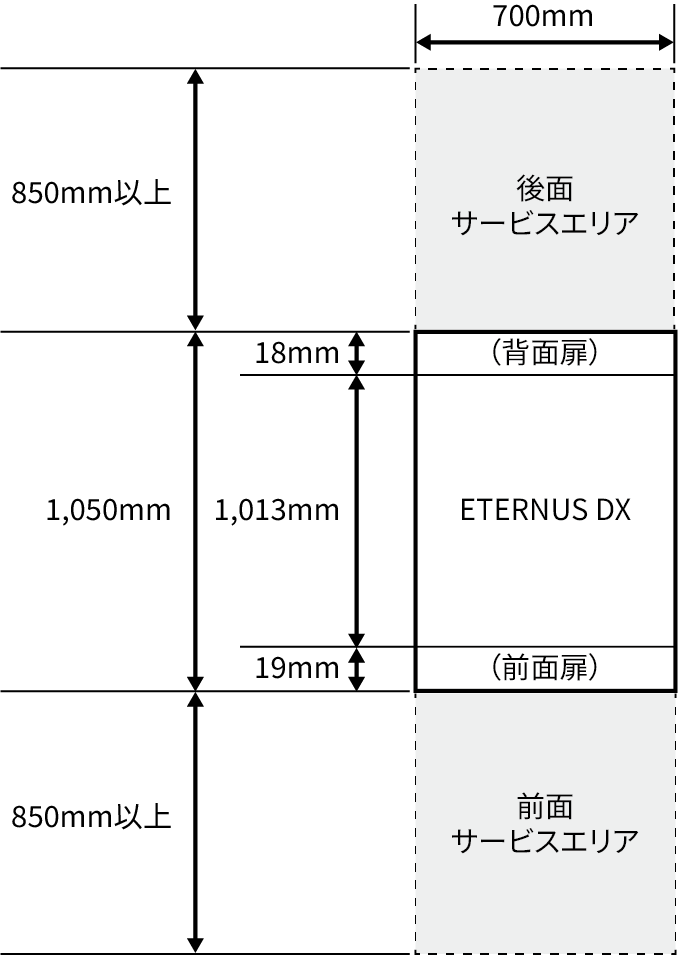 < PREVNEXT > 設置エリア 当社製19インチラックに搭載する場合の設置エリアとサービスエリアについて説明します。 ETERNUS DXの前後に以下のサービスエリアを確保してください。 図: 設置エリアとサービスエリア < PREVNEXT >