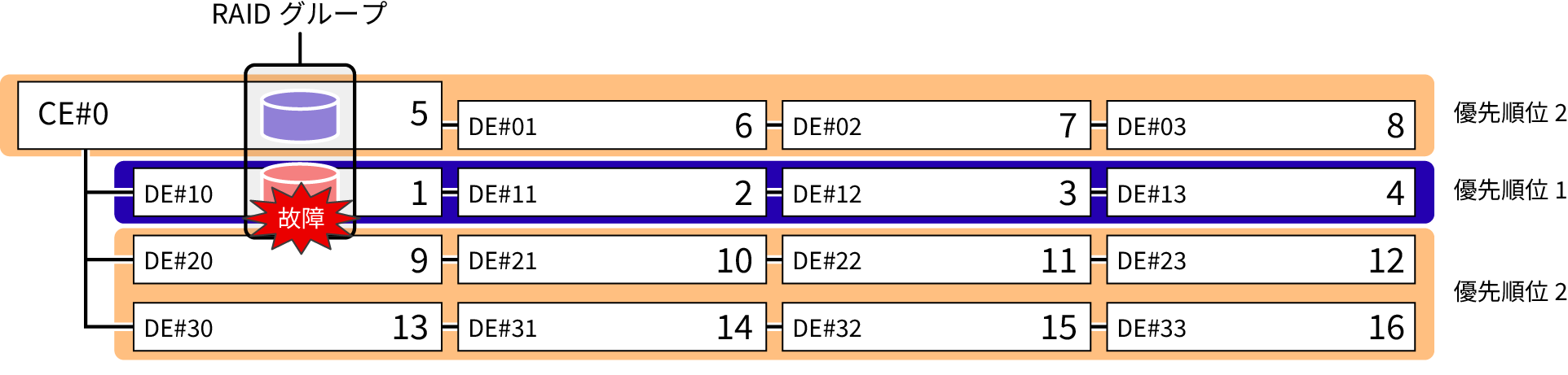 まず、故障ドライブと同一経路に存在するドライブエンクロージャ内のドライブの中から、ドライブの優先順位(1~4の順)でドライブが選択されます。同一経路上に適合するドライブがない場合は、ドライブエンクロージャの優先順位2に該当するドライブを対象に、ドライブの優先順位(1~4の順)に該当するドライブが選択されます。