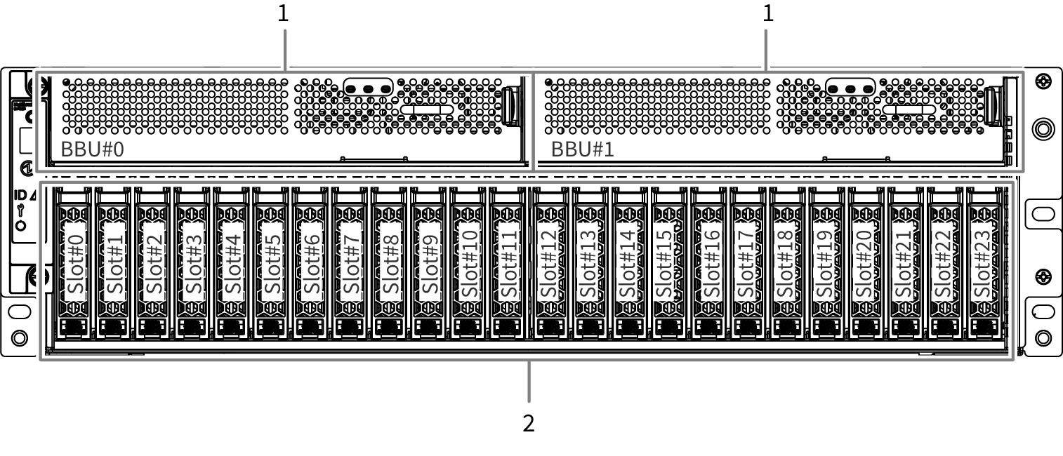 ETERNUS DX900 S6, ETERNUS DX8900 S6のコントローラーエンクロージャは、前面にオペレーションパネル、バッテリー、NVMe SSD、背面にコントローラー(CM)、ホストインターフェース(CA)、ドライブアダプター(DA)、電源ユニットなどを搭載する筐体です。