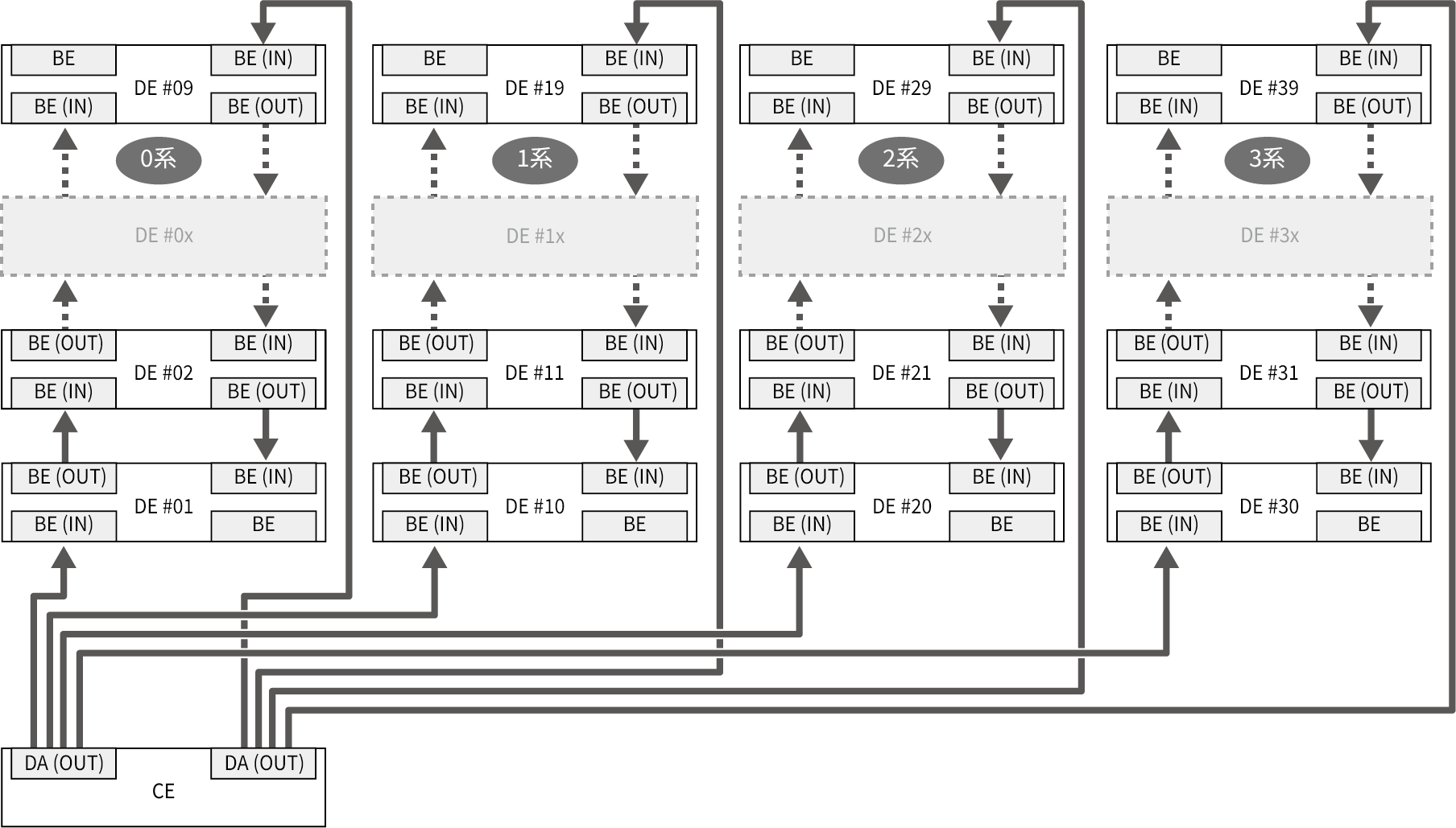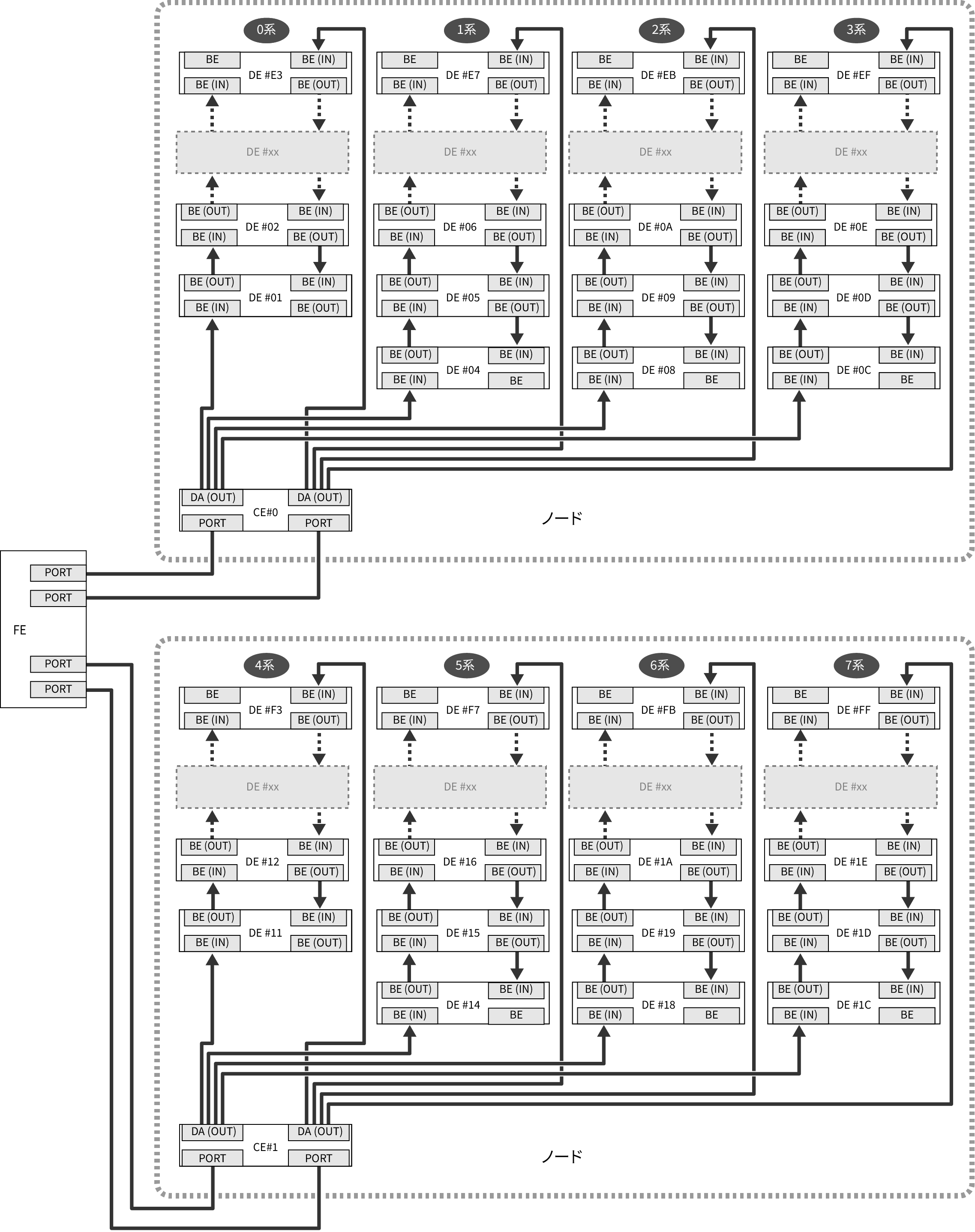 ETERNUS DX900 S6, ETERNUS DX8900 S6は、フロントエンドエンクロージャ(FE)とコントローラーエンクロージャ(CE)間、およびコントローラーエンクロージャとドライブエンクロージャ(DE)間を複数のパスで接続しています。