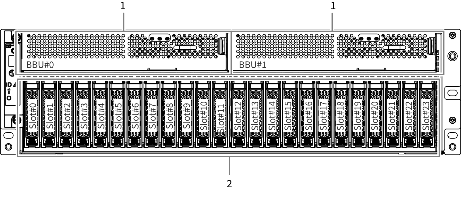 < PREVNEXT > ETERNUS DX900 S6, ETERNUS DX8900 S6 図: コントローラーエンクロージャ前面(ETERNUS DX900 S6, ETERNUS DX8900 S6、フロントカバーを付けた状態) オペレーションパネル(オペレーションパネル参照) フロントカバー 図: コントローラーエンクロージャ前面(ETERNUS DX900 S6, ETERNUS DX8900 S6、フロントカバーを取り外した状態) バッテリー(BBU#0, BBU#1)(BBU参照) 2.5インチドライブ(NVMe SSD)(ドライブ参照) < PREVNEXT >