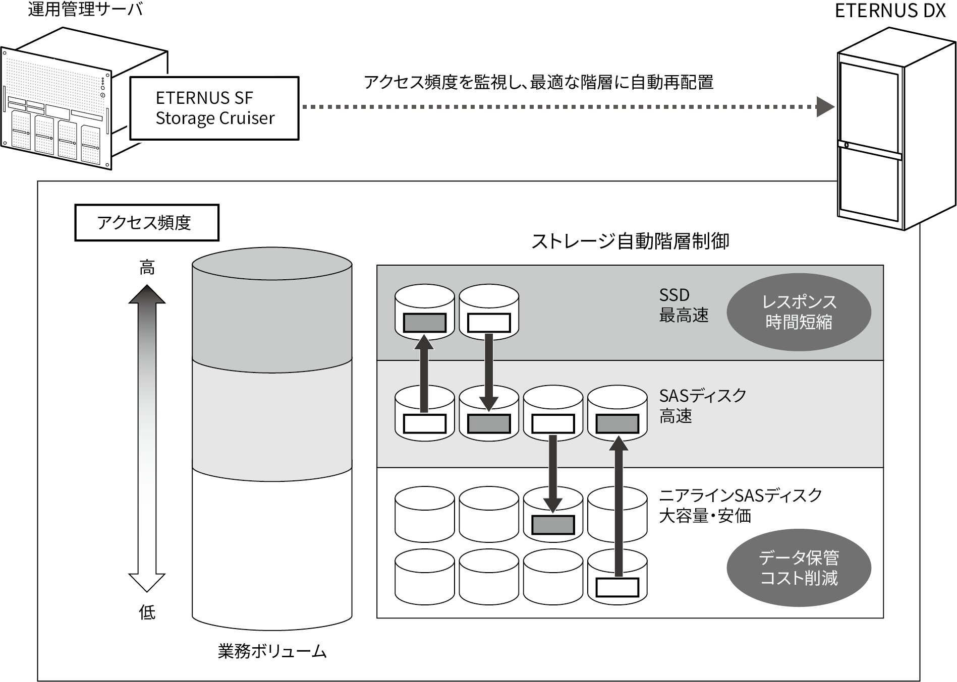 使用頻度の低いデータは大容量で安価なニアラインSASディスクへ配置することで、保管コストを低減できます。アクセス頻度が高いデータは高性能なSSDに配置することで、レスポンス時間を短縮し、パフォーマンスを向上させることができます。