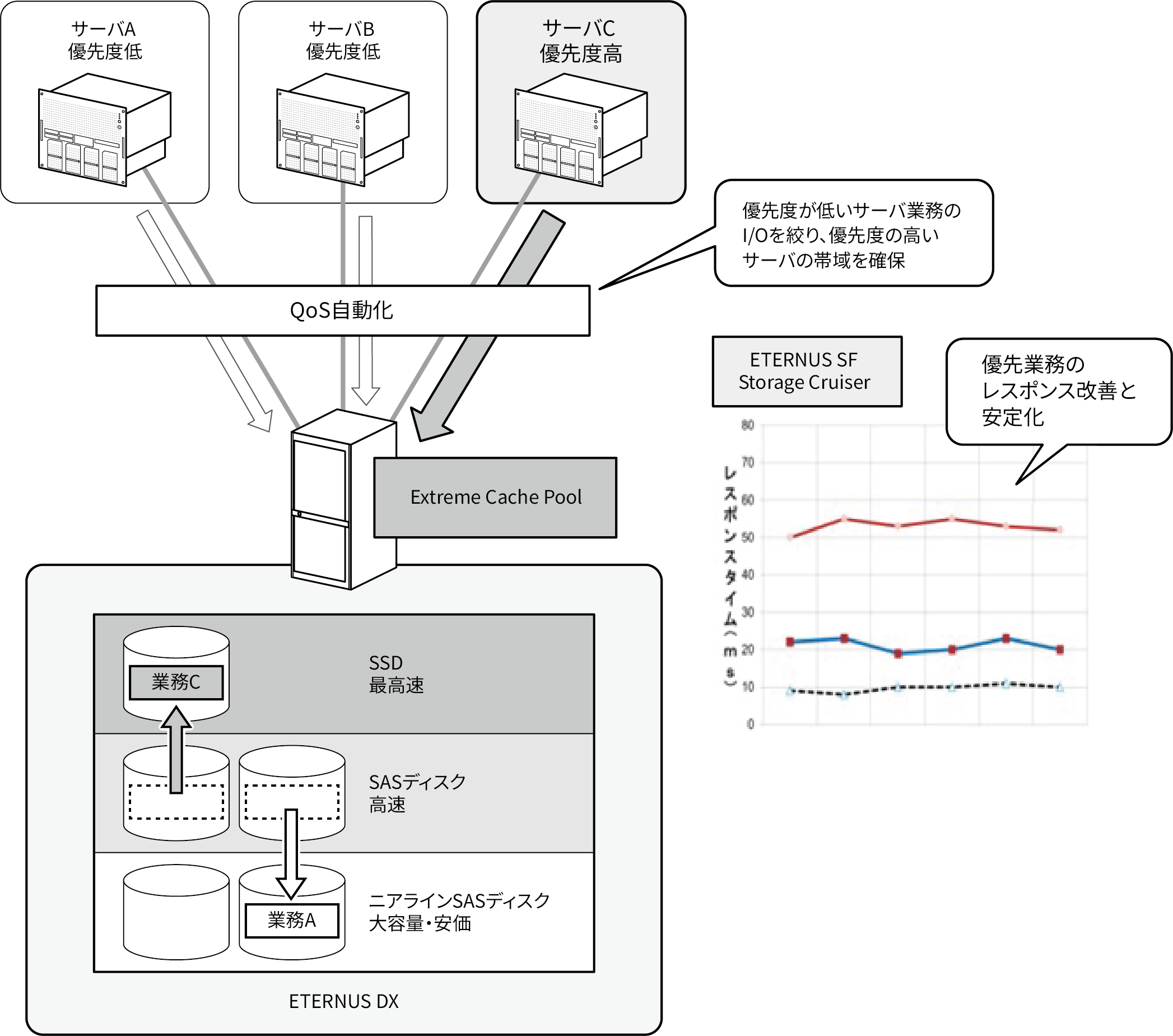 業務増加などに伴いETERNUS DXにアクセスするサーバの台数が増えると、既存のシステムの性能にも影響が及ぶことがあります。ETERNUS SF Storage Cruiserを導入してQoS(Quality of Service)を自動化すると、利用者が目標値として設定した処理性能を自動チューニングできます。業務の優先度に応じてサーバの帯域を確保することによってほかのサーバから影響を抑えられるため、優先度の高い重要業務サーバの性能を確保できます。
