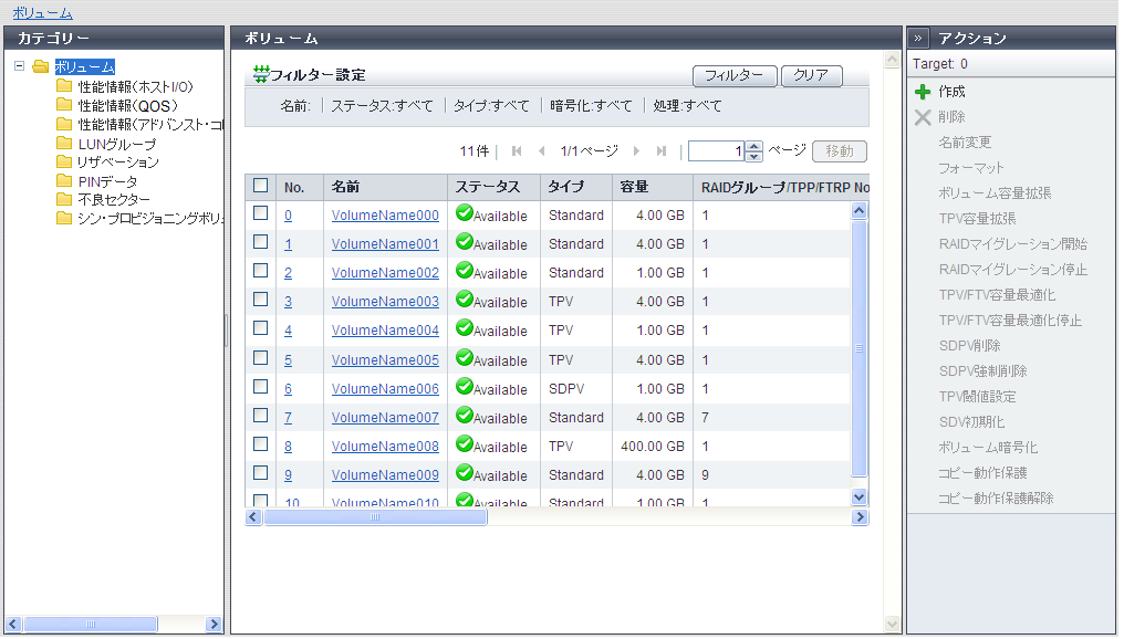 < PREVNEXT > ボリュームの確認 [ボリューム詳細]画面で、お客様の作成したボリュームの状態を表示します。ボリュームが正しく設定されているか確認してください。 [ボリューム詳細]画面は、ナビゲーションの[ボリューム]タブをクリックして、[ボリューム(基本情報)]画面で状態を確認したいボリュームの「No.」または「名前」をクリックすると表示されます。 表示例(ETERNUS DX600 S6) < PREVNEXT >