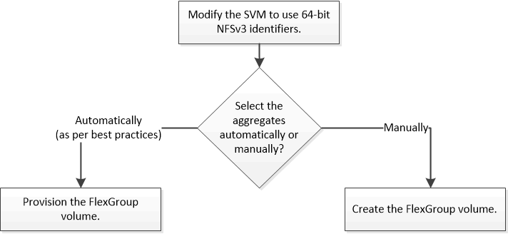 You can either provision a FlexGroup volume where ONTAP automatically selects the aggregates based on the best practices for optimum performance, or create a FlexGroup volume by manually selecting the aggregates and configuring it for data access.