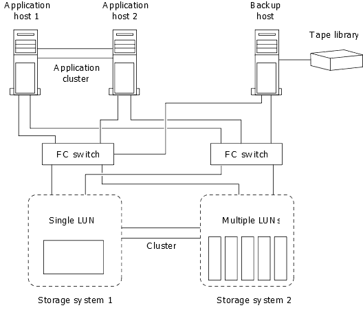 It is imperative that you keep SAN and NAS data separated for backup purposes. The figure below shows the recommended physical configuration for a host backup system to the primary storage system. You must configure volumes as SAN-only. LUNs can be confined to a single volume or the LUNs can be spread across multiple volumes or storage systems.