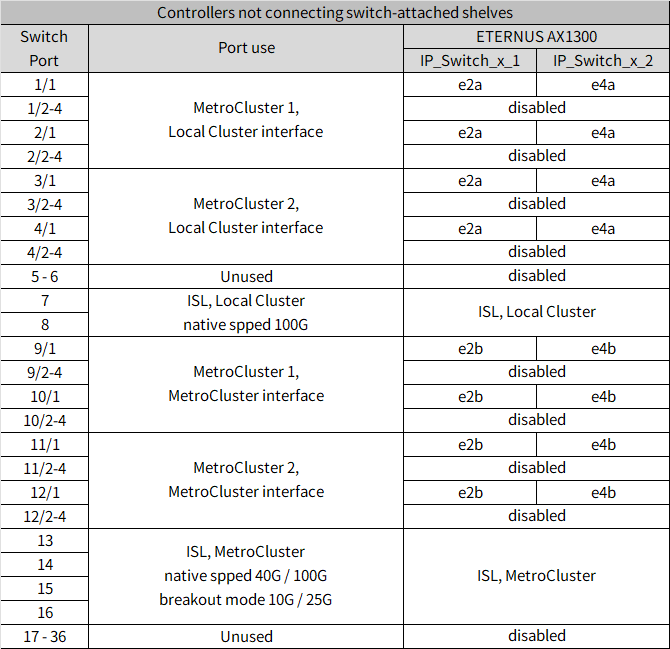 If your second MetroCluster or DR group doesn’t connect NS224 shelves to the MetroCluster switch, follow the cabling tables for controllers not connecting switch-attached NS224 shelves.