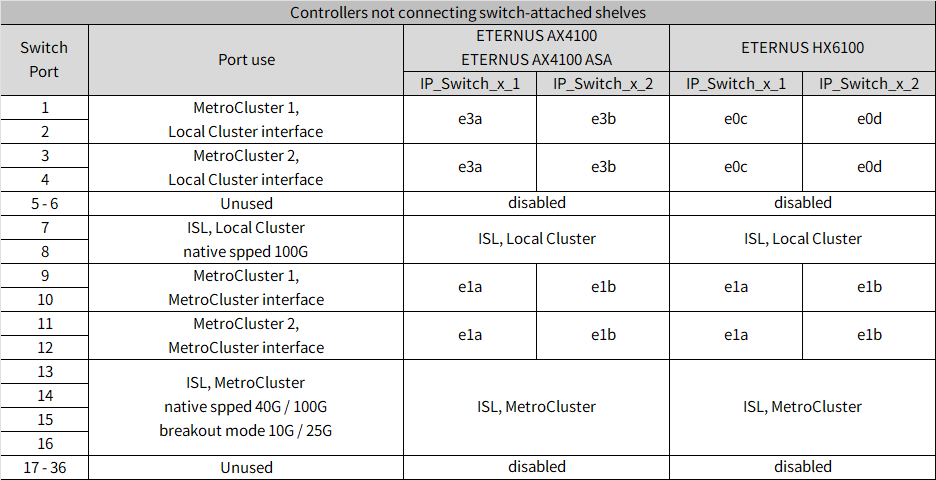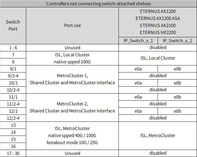 Review the platform port assignments to cable a ETERNUS AX2200, ETERNUS AX2200 ASA, ETERNUS AC2100, or ETERNUS AC2100 ASA system that isn’t connecting switch-attached NSS24 shelves to a Cisco 9336C-FX2 switch: