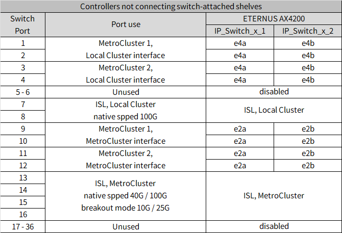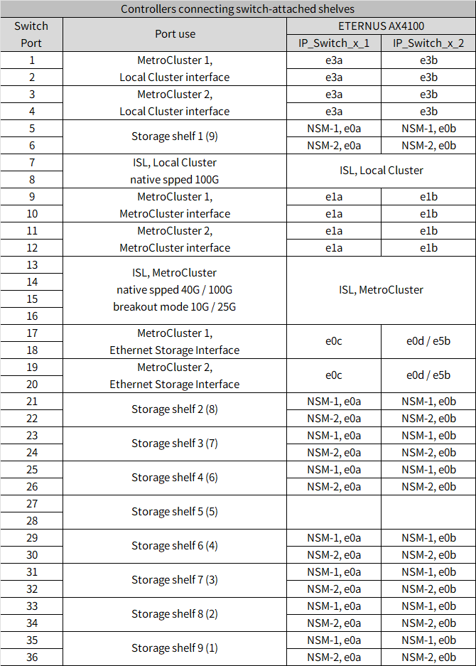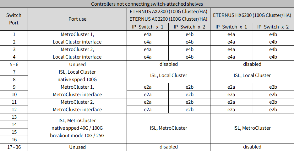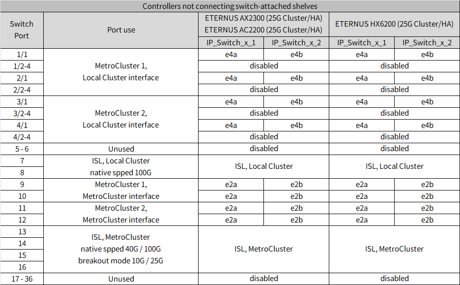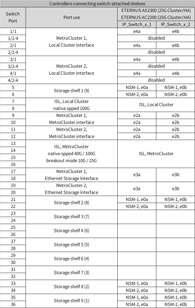 The tables in this section are for 36-port Cisco 9336C-FX2 switches when at least one MetroCluster configuration or DR group is connecting NS224 shelves to the MetroCluster switch.